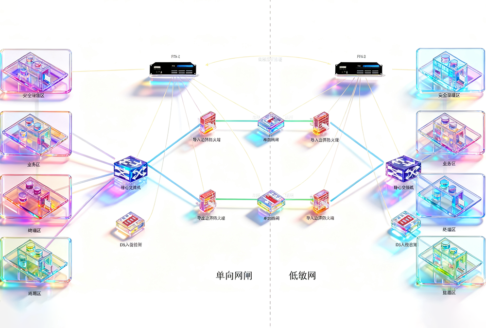 依靠自身核心技术和理念,严格按照国家保密局及相关政策要求创新技术应用和解决方案,用完全自主知识产权的数据安全交换与日志监控系统(FTS DXM)实现多阶网络安全交换全局监控。