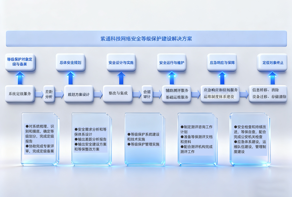 紫通科技针对网络安全等级保护实施的六个关键阶段——定级与备案、总体安全规划、安全设计与实施、安全运行与维护、应急响应与保障,以及定级对象终止,提供全流程、一站式的解决方案。